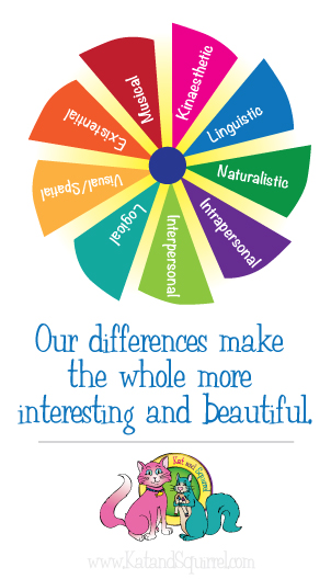 Our differences make the whole world more interesting and beautiful.If you are more of the lip-synching, can’t keep a beat type person (like me), then you know how wonderful it is to have a student who is musically talented. Oh, how I love to have them lead the ABCs or Happy Birthday. Everyone has unique talents, and we can strengthen any skills through practice and perseverance. Kids need to understand their strengths and appreciate the hard work people put in to enjoy high levels of talent. Some of these strengths and intelligences are cultivated in school and some are not. Check out this beautiful infographic of Howard Gardner’s 9 types of intelligence by artist Diana Ziv.
